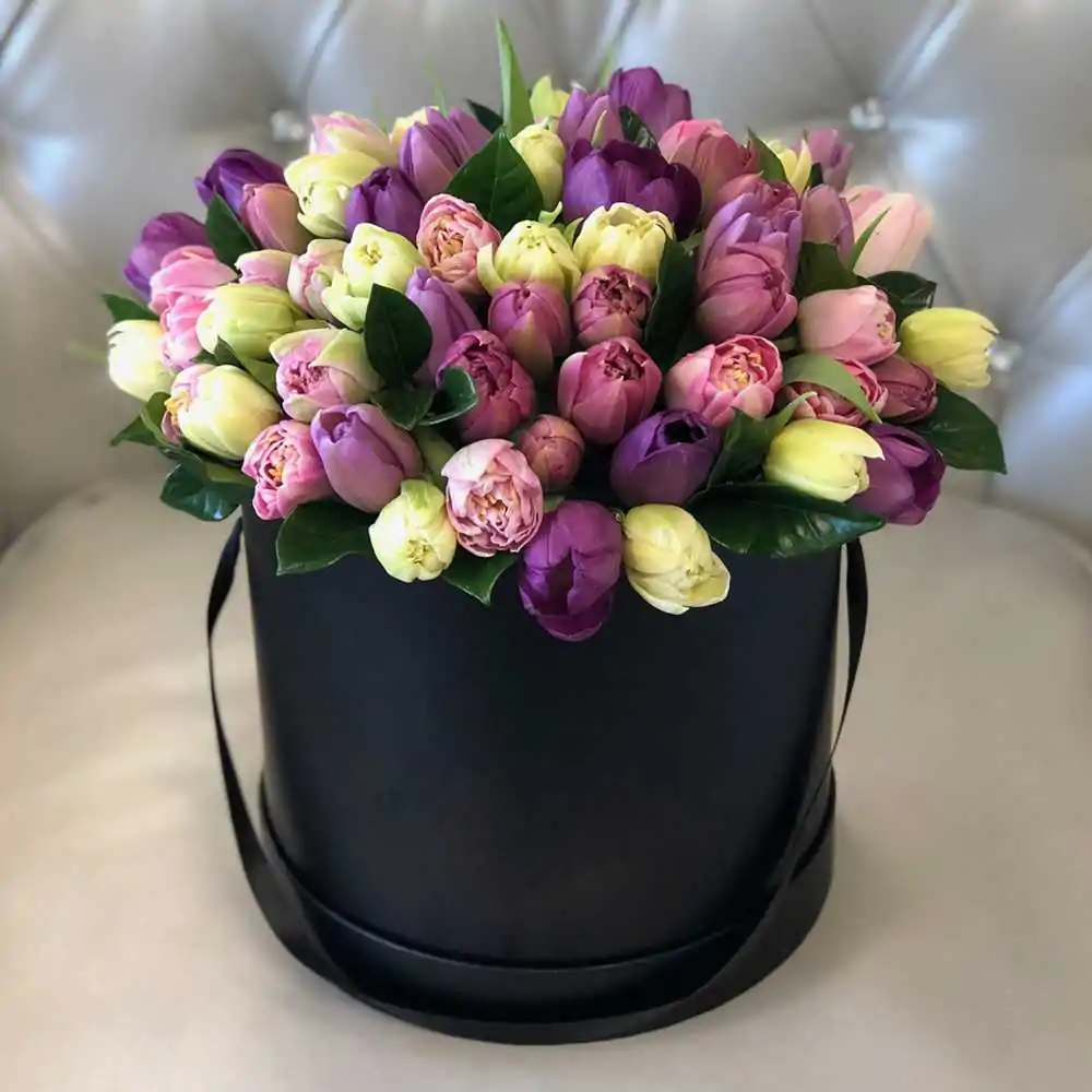 Данную композицию возможно сделать не только в коробке, но и в корзине или просто букетом.