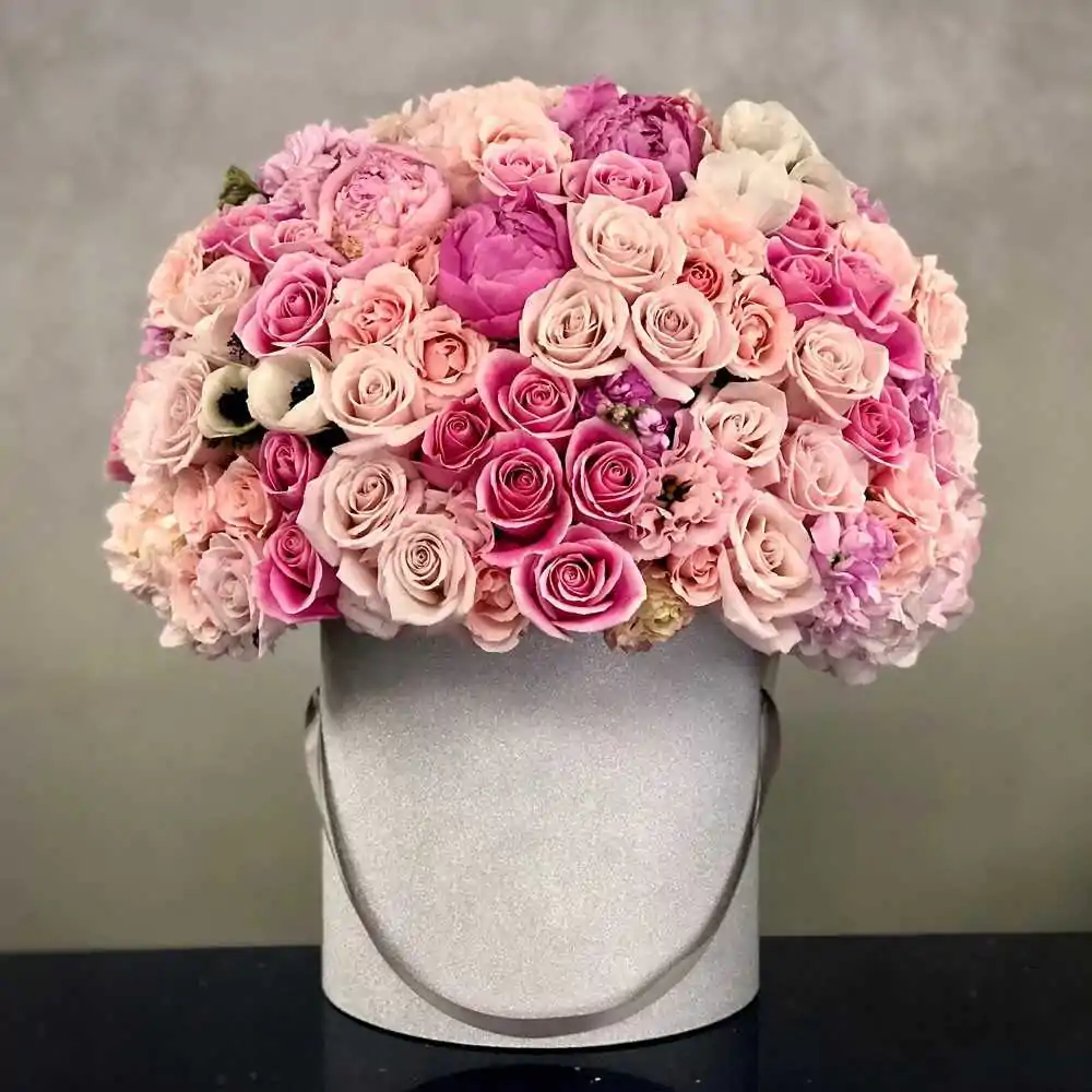 Данную композицию возможно сделать не только в коробке, но и в корзине или просто букетом.