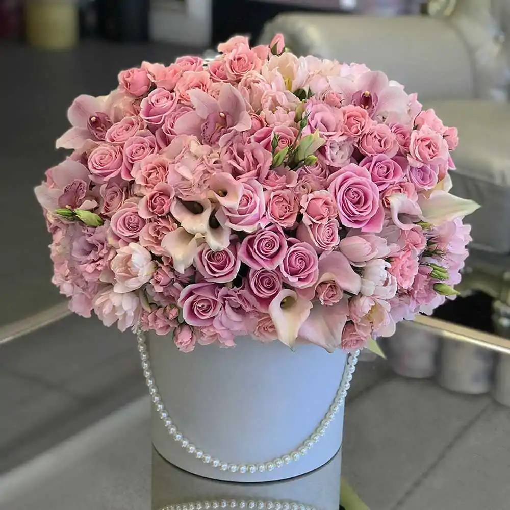 Данную композицию возможно сделать не только в коробке, но и в корзине или просто букетом.